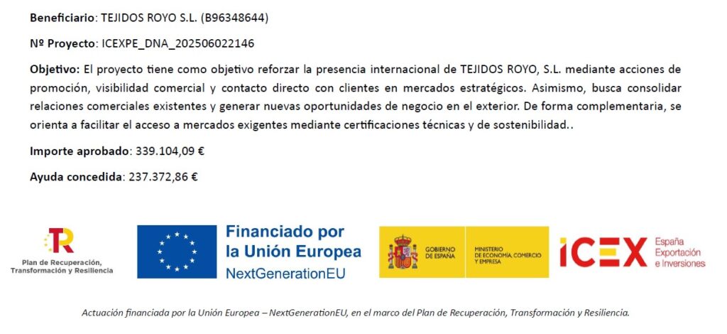 TEJIDOS ROYO obtiene ayuda del IVACE para la certificación de sus proyectos de I+D+I a efectos de deducción fiscal según el art. 35 de la Ley de Impuestos y Sociedades (Ley 27/2014). Las ayudas Programa de Certificación de I+D+I 2016 de IVACE han subvencionado parcialmente la certificación del proyecto presentado a efectos de obtención del Informe motivado Vinculante ante el Ministerio de Economía, Industria y Competitividad.